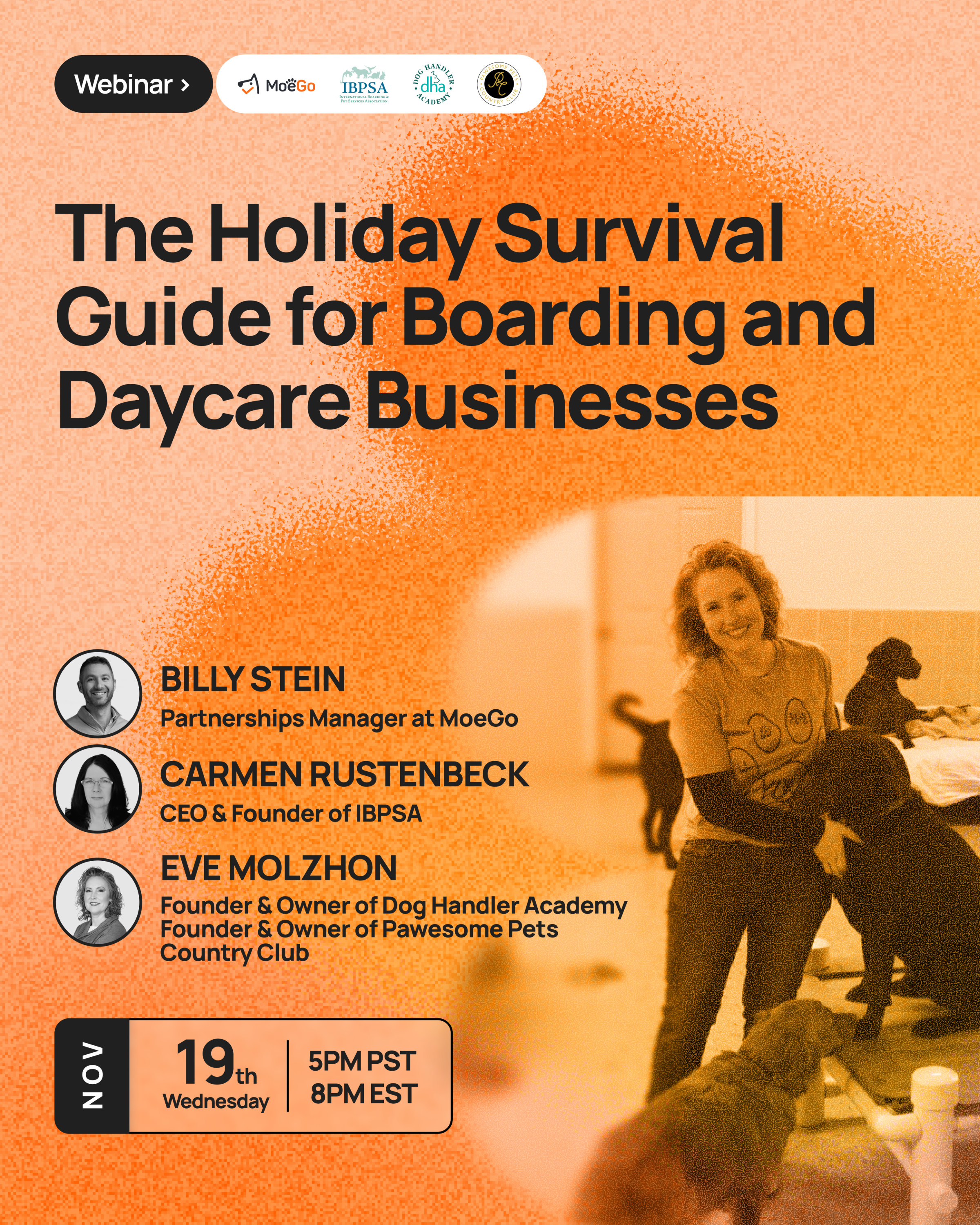 Join MoeGo, IBPSA, and Dog Handler Academy for an exclusive webinar designed to help you navigate the holiday rush with confidence. You’ll walk away with proven strategies to boost occupancy, optimize pricing, motivate your staff, and deliver an exceptional experience for both pets and their parents—all while keeping your sanity intact.